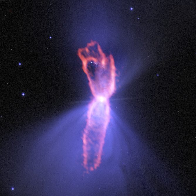 ハッブル宇宙望遠鏡が捉えた美しい蝶ネクタイの姿は、中心にある円盤状の濃いチリが星の光を遮ることで生まれた「影絵」でした。真実の大部分は、その塵のカーテンの向こうに隠されていたのです。