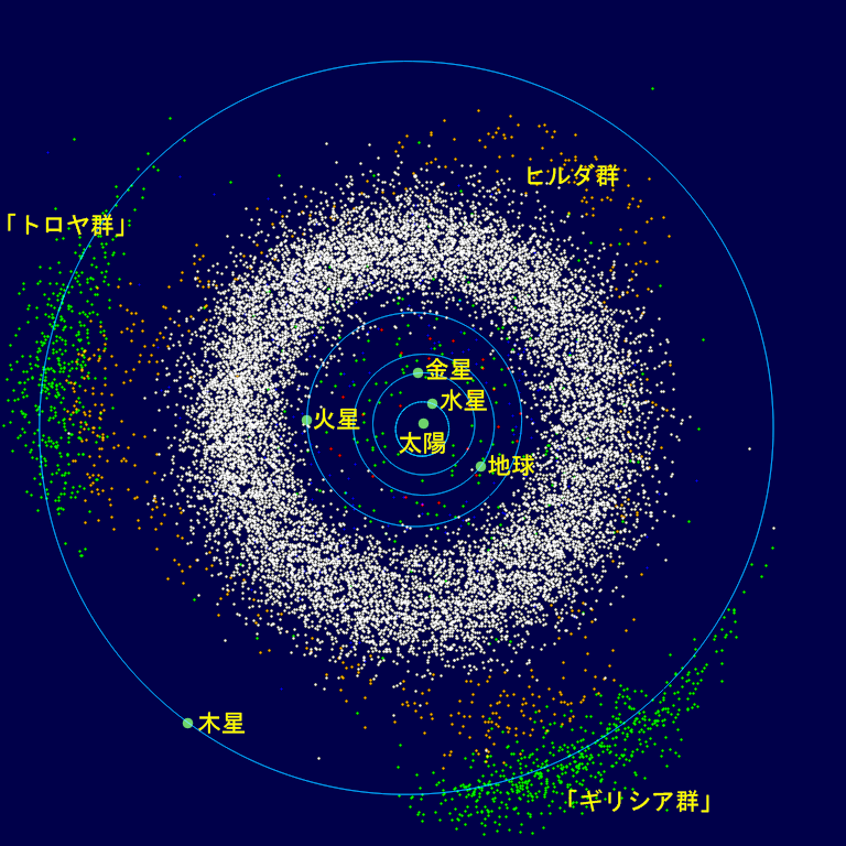 - トロヤ群小惑星 (Trojan Asteroids):木星など、惑星の公転軌道上にあるL4とL5の安定ラグランジュ点に集まっている小惑星のグループ。